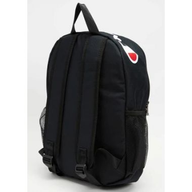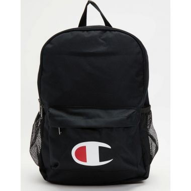 Champion Medium Backpack. Champion script branding at top and C logo on front. A main compartment and front zip pocket. Dual mesh drink bottle holders. Color - black