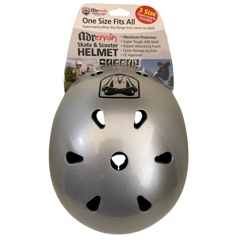 Adrenalin Skate and Scooter Helmet. One size fits all. Foam inserts allows adjustable size range from junior to adult. Maximum protection with a super tough ABS shell, impact absorbing foam and easy strap adjustment with quick release buckles. CE approved. Color silver
